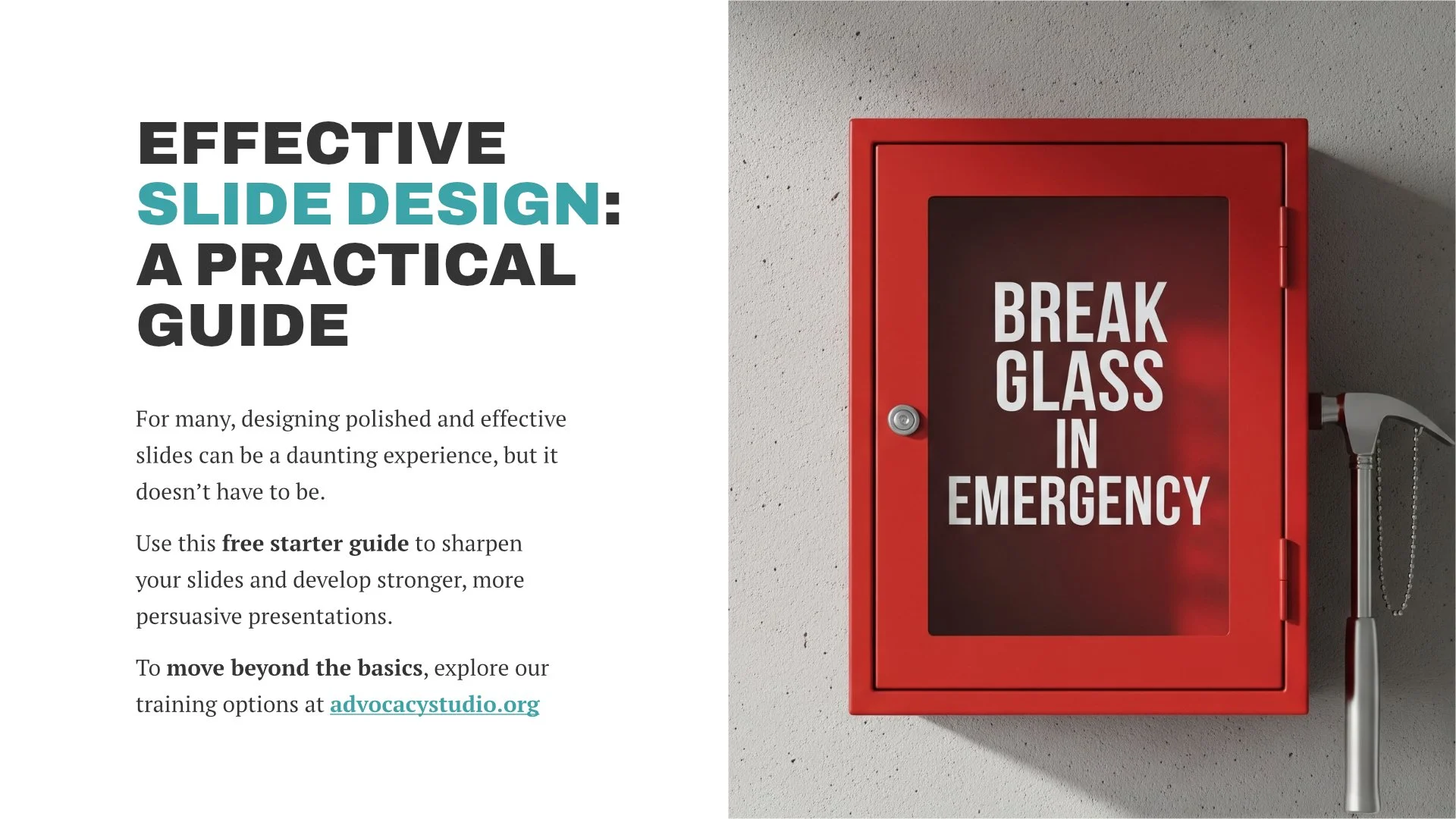 Effective Slide Design: a practical guide This free guide walks you through the essentials of effective slide design — how to strip away clutter, highlight key messages, and create slides that work with you, not against you. Get your free guide now Just enter your details below First Name Last Name Email Address Sign Up By entering your details, you will receive a link to download Effective Slide Design: a practical guide and be added to The Advocacy Studio mailing list. We collect your first and last name to personalise communications, and your email to deliver resources. We will share the guide as well as occasional resources, updates, and offers in the future. You can unsubscribe or request deletion at any time. See our Privacy Policy for full details. Thanks for signing up!Your guide is ready.